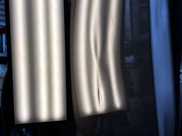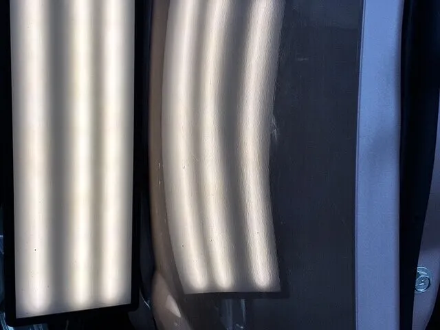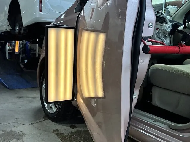 ドアを開けた状態で見ると一目瞭然、 縦に大きく歪みが出ていて、光を当てると波打ちがハッキリ分かる状態でした。