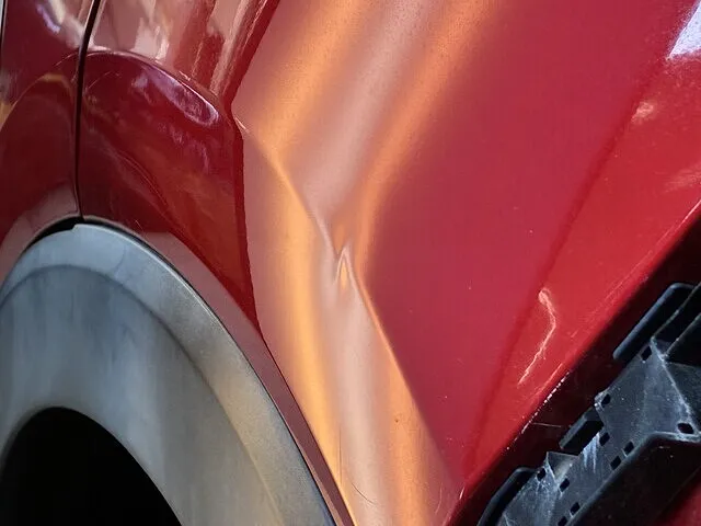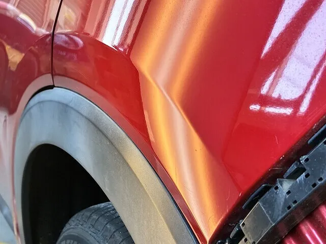 赤いボディに映る光のラインを見てみると、プレスライン上に小さくヘコミがあります。