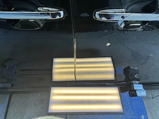 専用ライトでパネルの歪みを確認しながら、熟練の職人が丁寧に凹みを整形しました。 調整を繰り返し、凹みは完全に消え、ボディラインも自然な映り込みが戻りました。